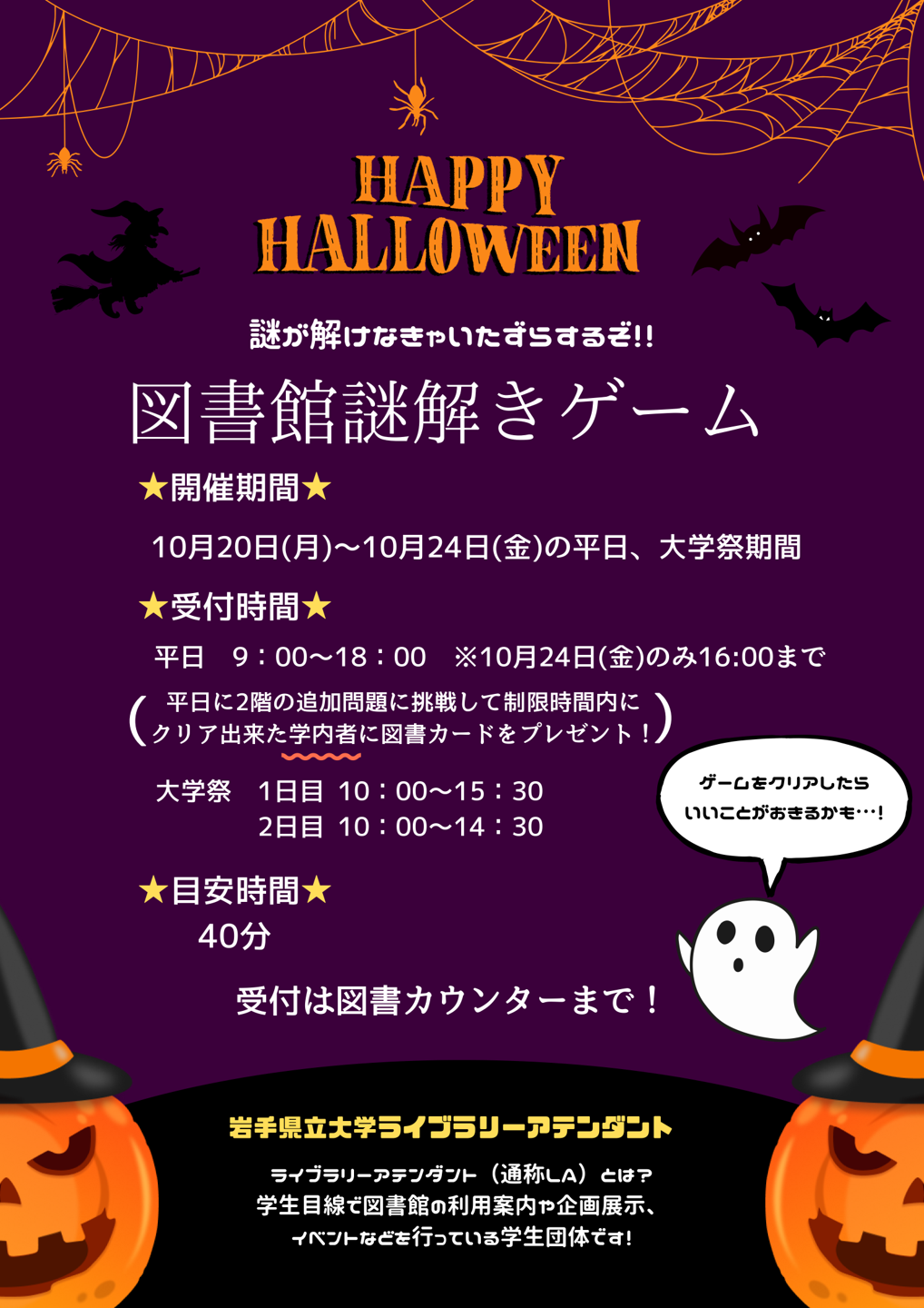 図書館では、10月20日(月)から24日(金)までの平日と大学祭期間(10月25日(土)・26日(日))、学生スタッフ「ライブラリー・アテンダント(LA)」の企画による図書館謎解きゲームを開催します!